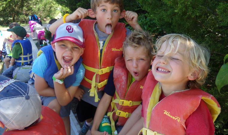 Four kids wearing life vests at a summer camp